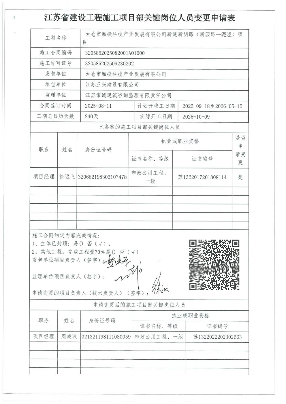 【建造师变更】太仓市厢投科技产业发展有限公司新建新明路(新园路—泥泾)项目-最高限价